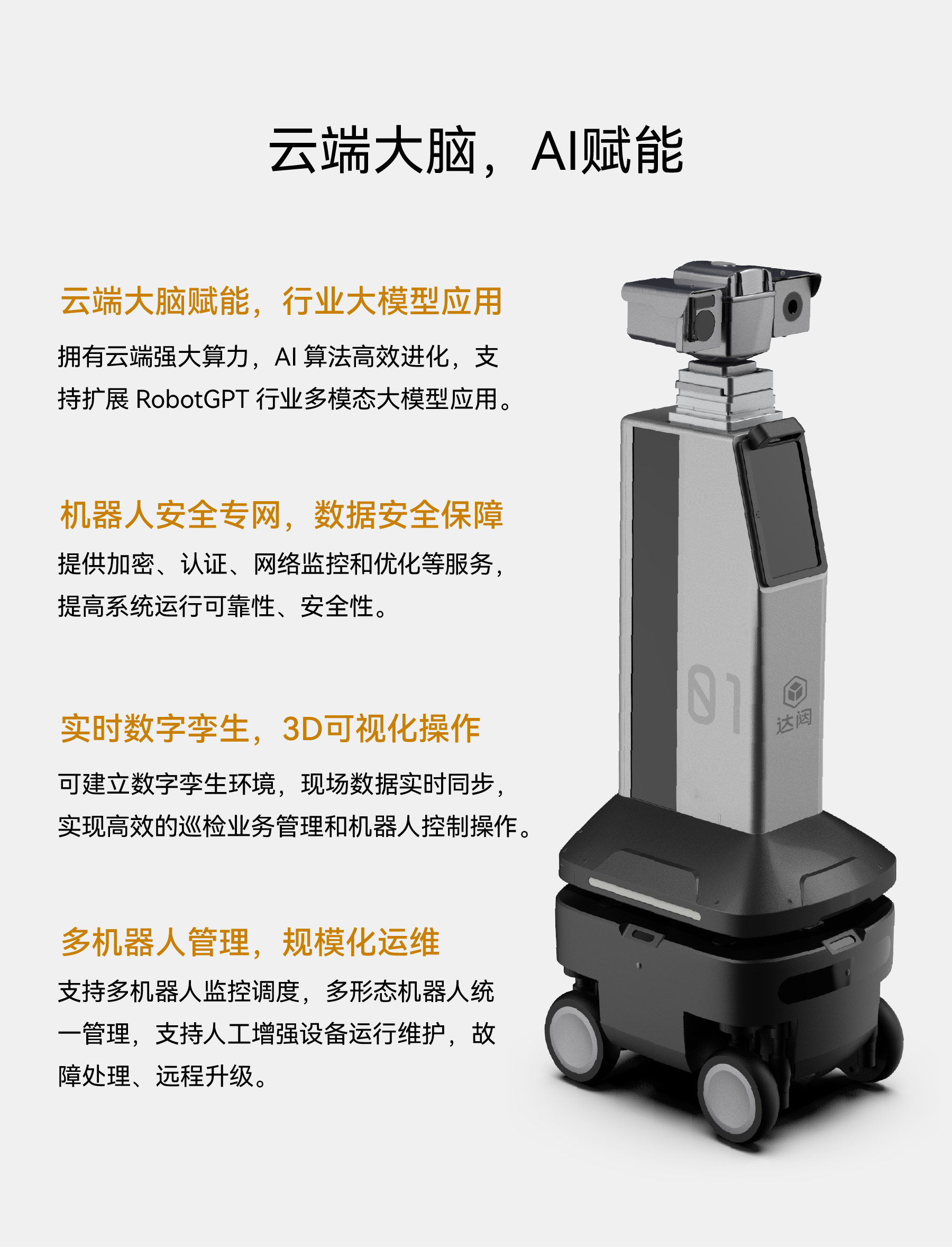 四舵轮底盘可360°全向移动,越障、爬坡、过沟能力超强;机身设计小巧,适合狭窄、复杂环境