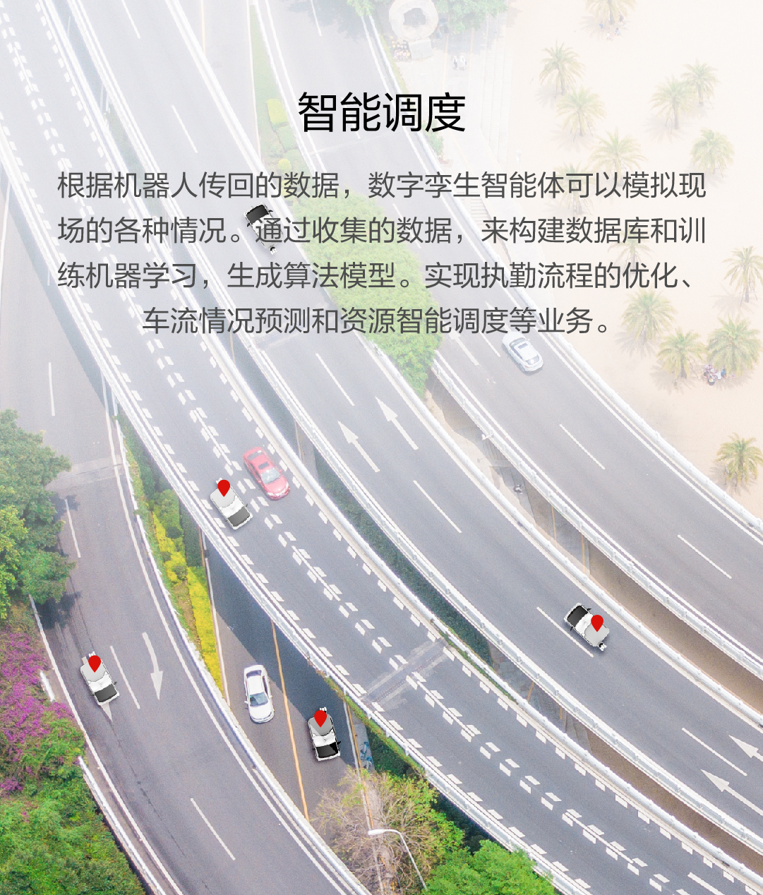 根据机器人传回的数据,数字孪生智能体可以模拟现场的各种情况。通过收集的数据,来构建数据库和训练机器学习,生成算法模型。实现执勤流程的优化、车流情况预测和资源智能调度等业务。
